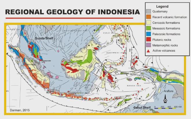 Berikut adalah peta yang menunjukkan tektonik Indonesia dan fenomena alam yang terkait: